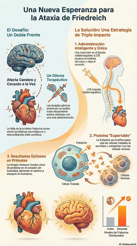 - Ciencia de vanguardia: Es una técnica mucho más avanzada que promete no solo ayudar en la Ataxia de Friedreich (AF), sino abrir puertas para otras enfermedades del sistema nervioso.